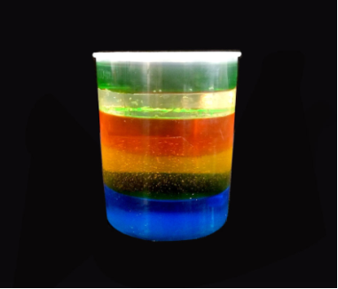步驟3:沿著攪拌棒依次將帶有色素的甘油、洗潔精水、油、酒精倒入量杯中,最終出現(xiàn)了顏色分層。